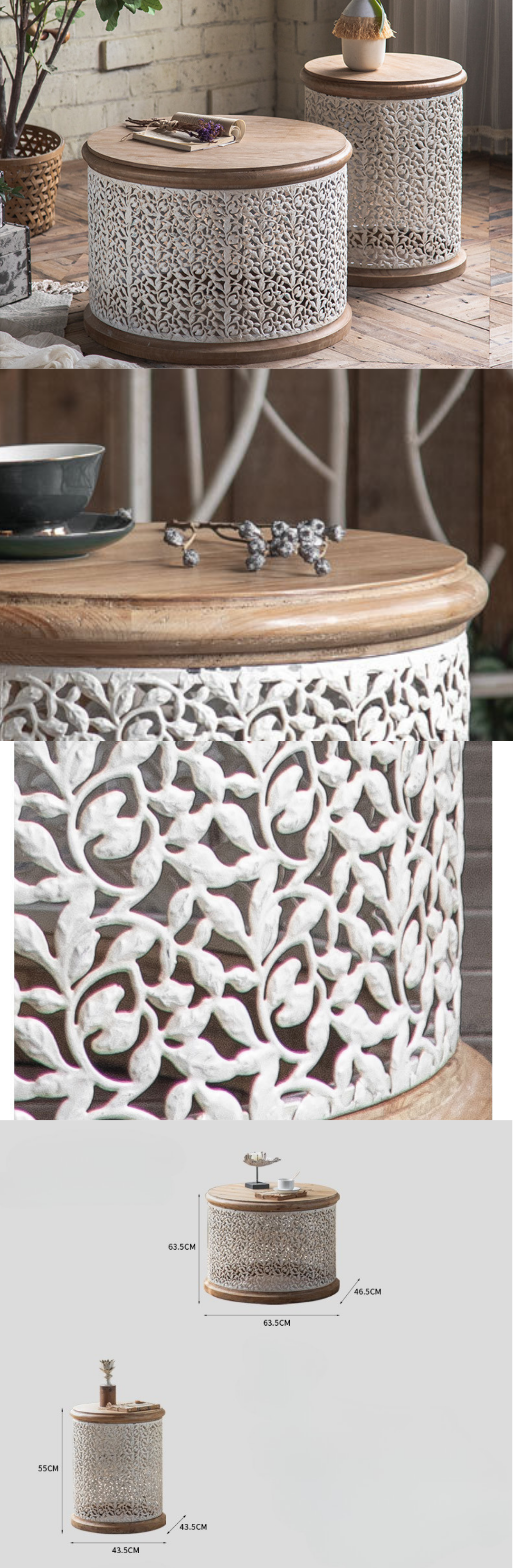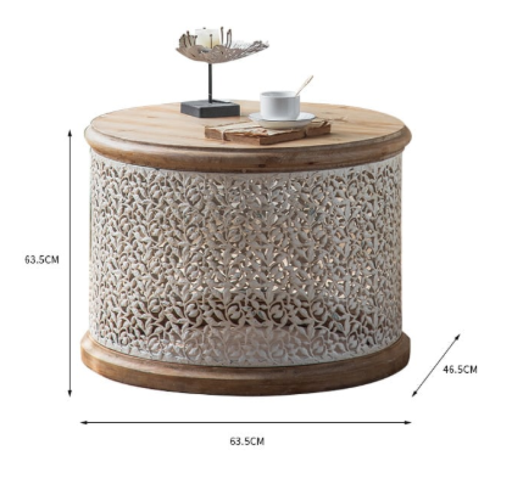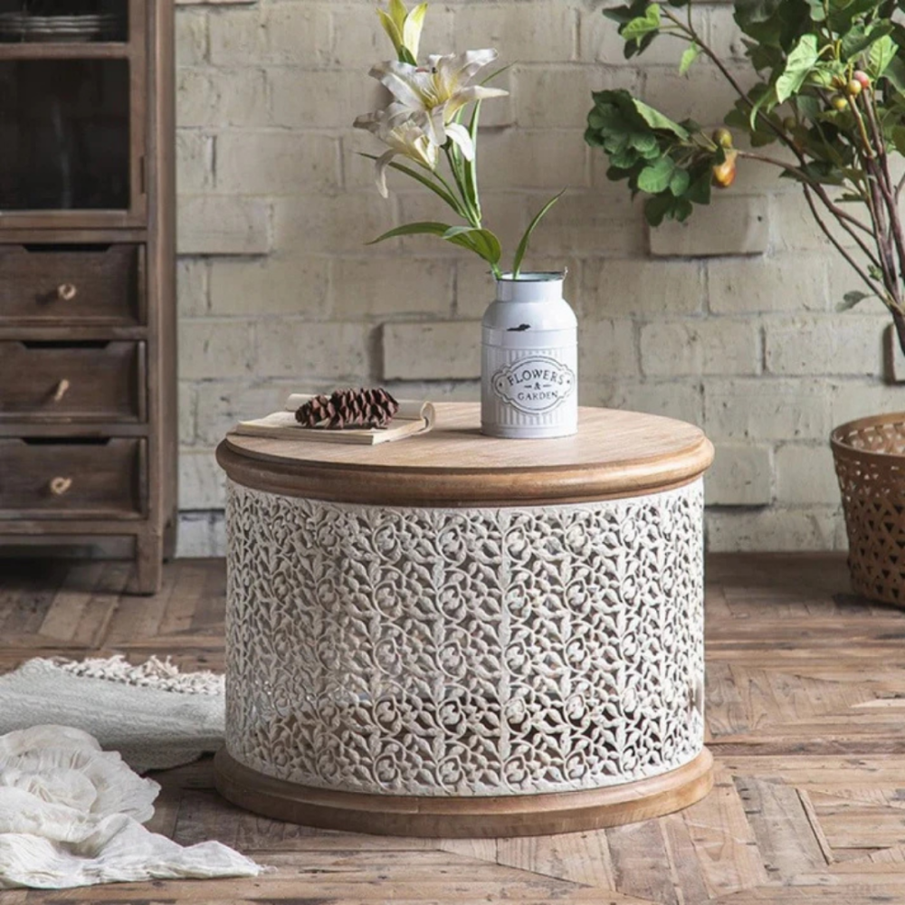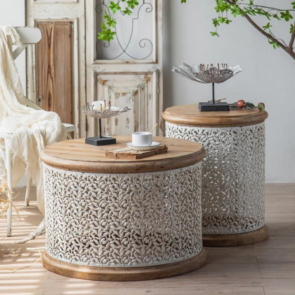 طاولة الفريدة. تتميز بسطح خشبي صلب مقاوم للحرارة وقاعدة متينة من الخشب الصلب لضمان الثبات ومقاومة الاهتزاز. النقوش ثلاثية الأبعاد المنحوتة يدويًا تضفي جمالًا استثنائيًا على التصميم.