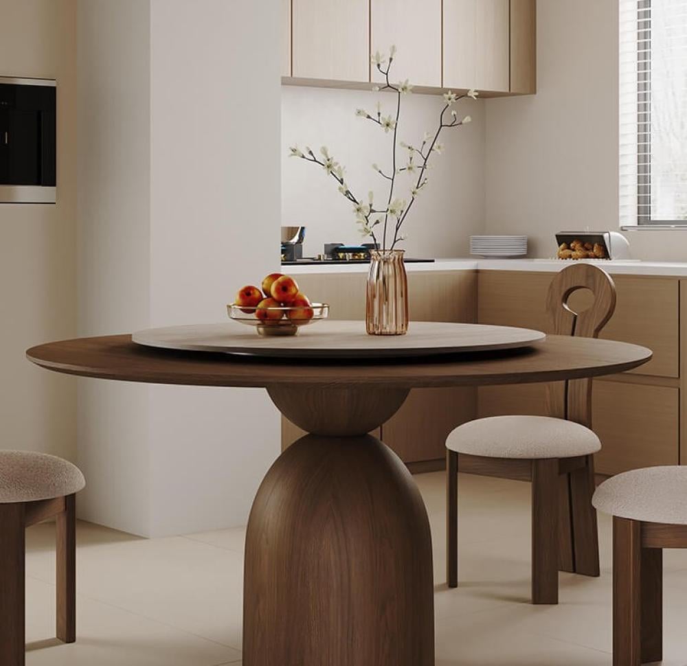 طاولة طعام دائرية فاخرة من دون كراسي بتصميم يجمع بين الرقي والعملية، مثالية للجلسات العائلية والمناسبات. مصنوعة من خشب متين بلمسات أنيقة، وتتميز بوجود صينية دوارة (Lazy Susan) في المنتصف، تسهّل التقديم وتضيف لمسة عصرية عملية.