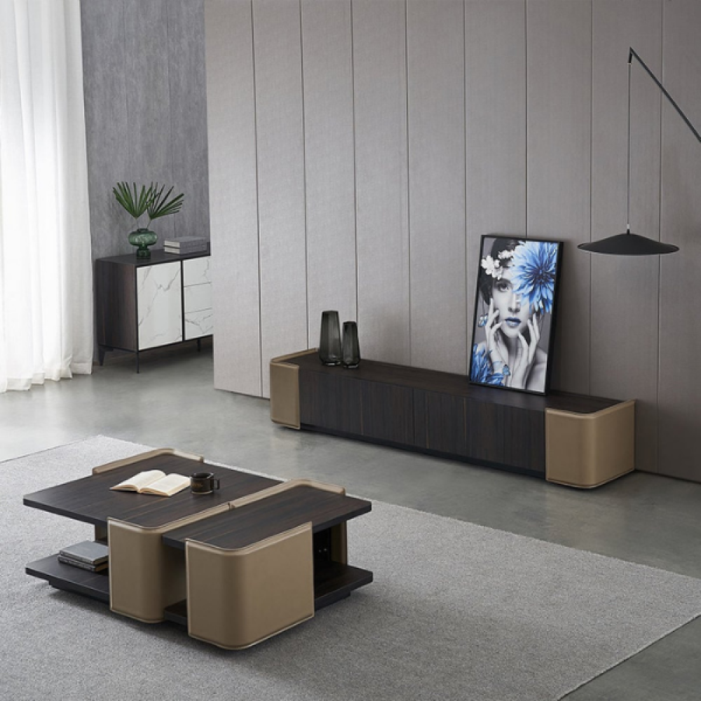 طاولة قهوة مزدوجة تتميز بتصميم عصري وأنيق، مما يجعلها إضافة مثالية لأي غرفة معيشة. توفر مرونة في الاستخدام بفضل المقاسات المختلفة للطاولتين، مما يسمح بترتيبها حسب احتياجات المساحة.