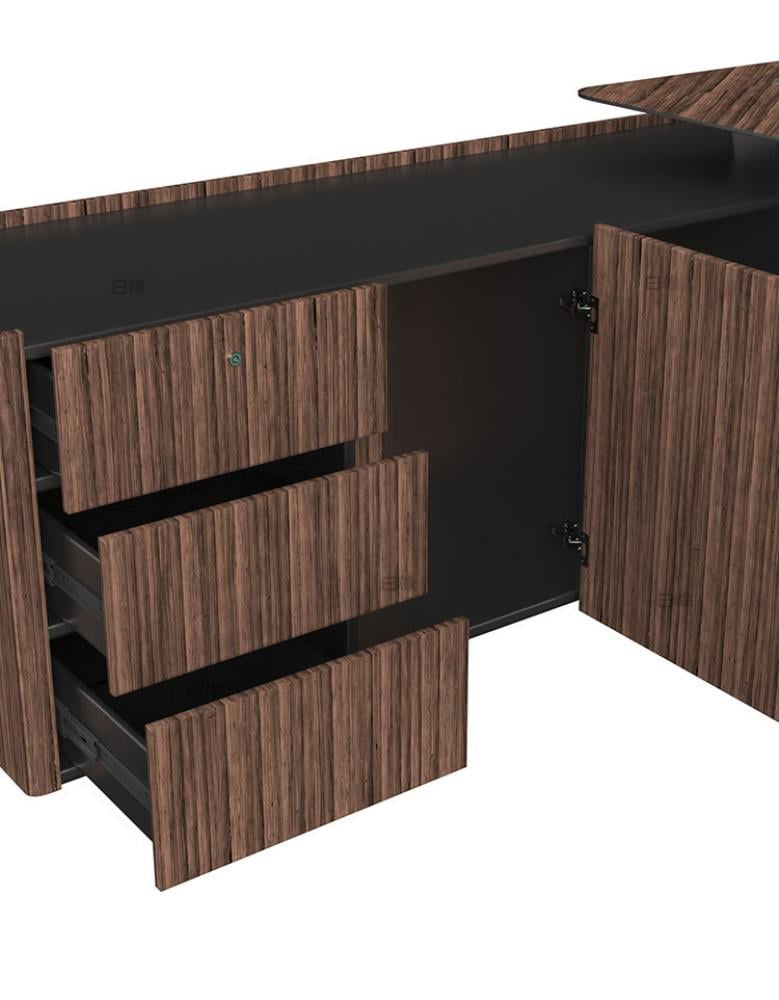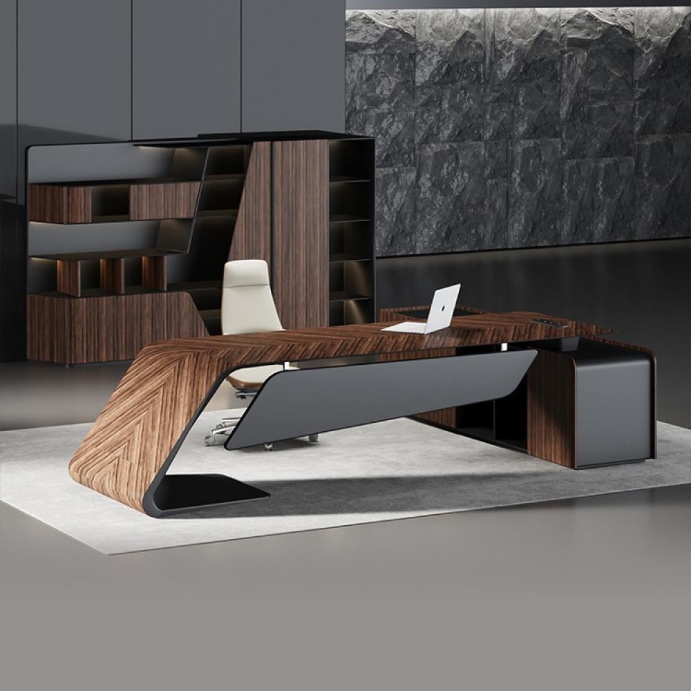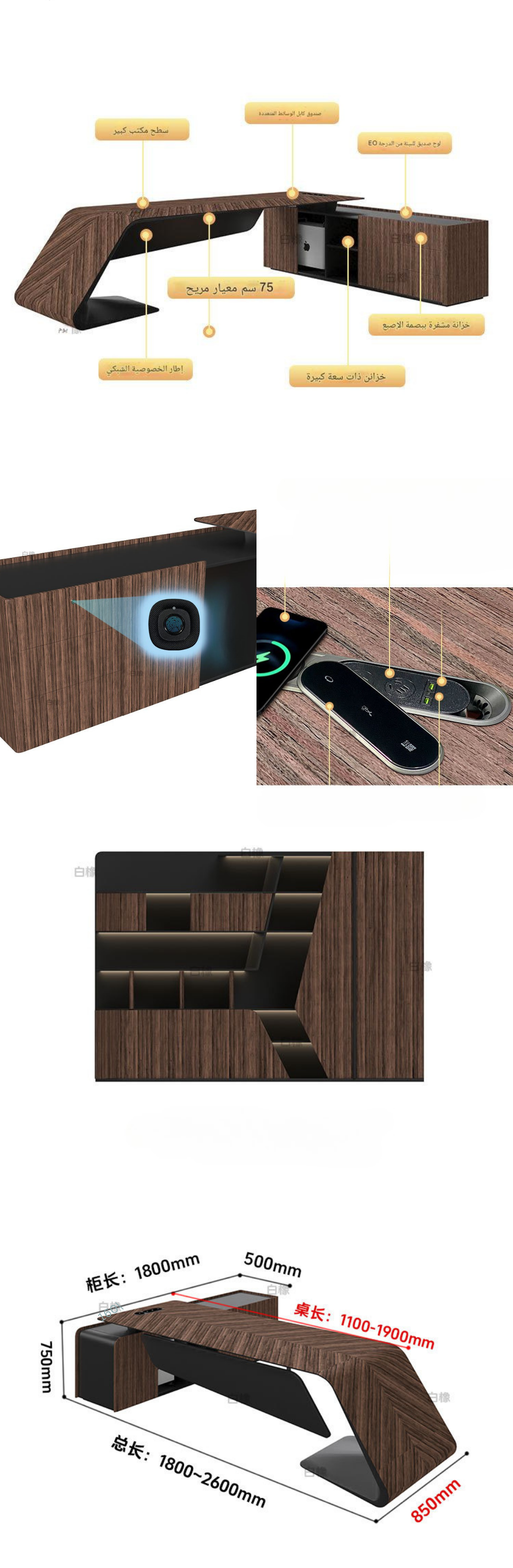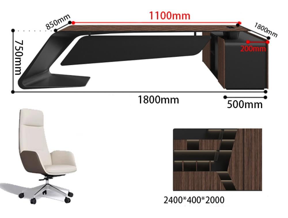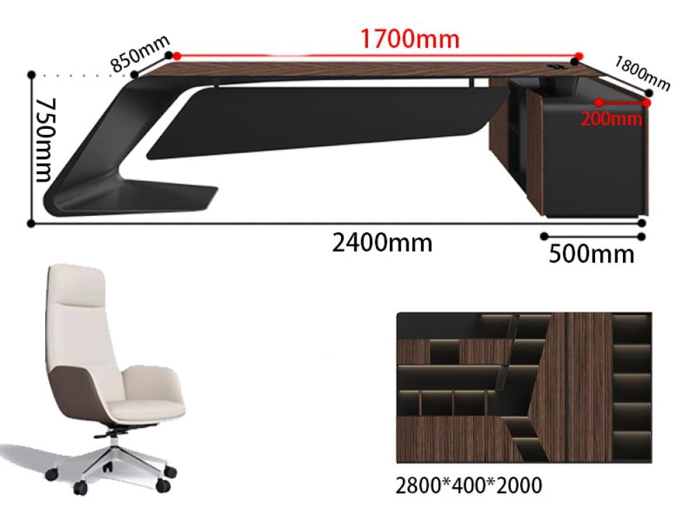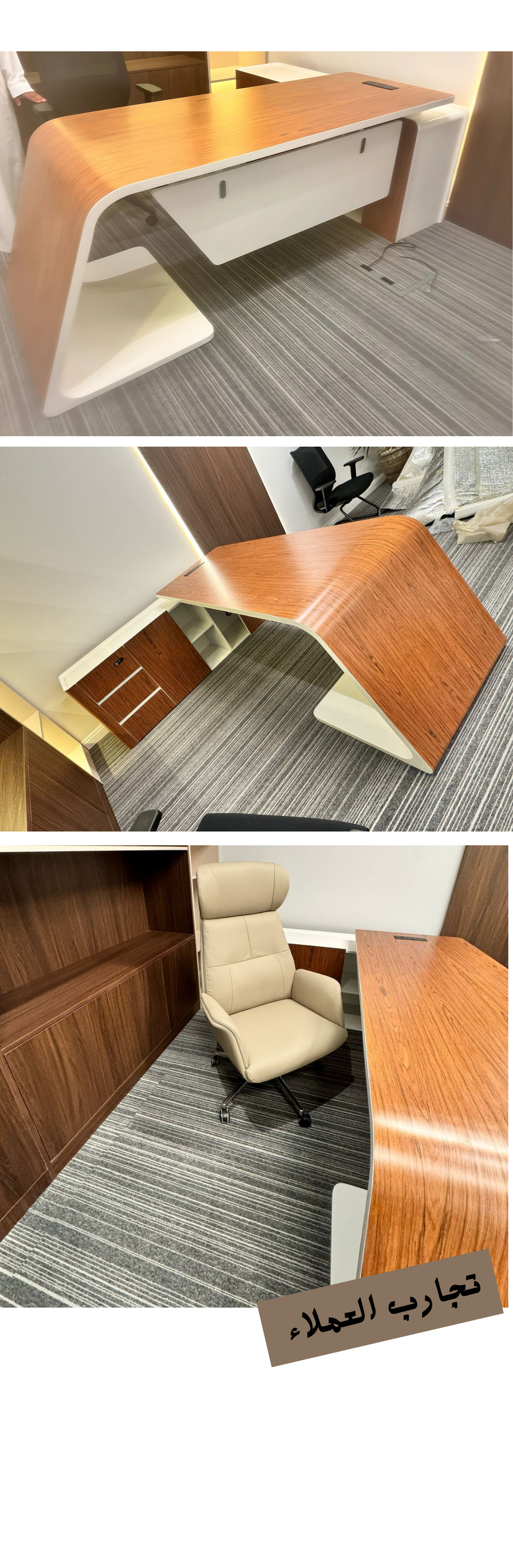 يشمل المنتجات التالية: مكتب بمقاسات مختلفة + كرسي مكتب جلد + خزانة بمقاسات مختلفة
