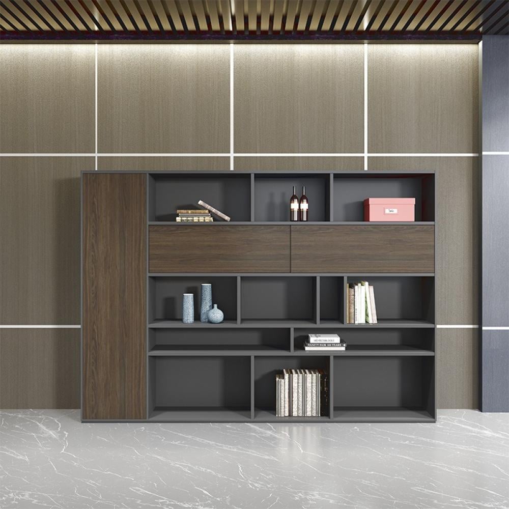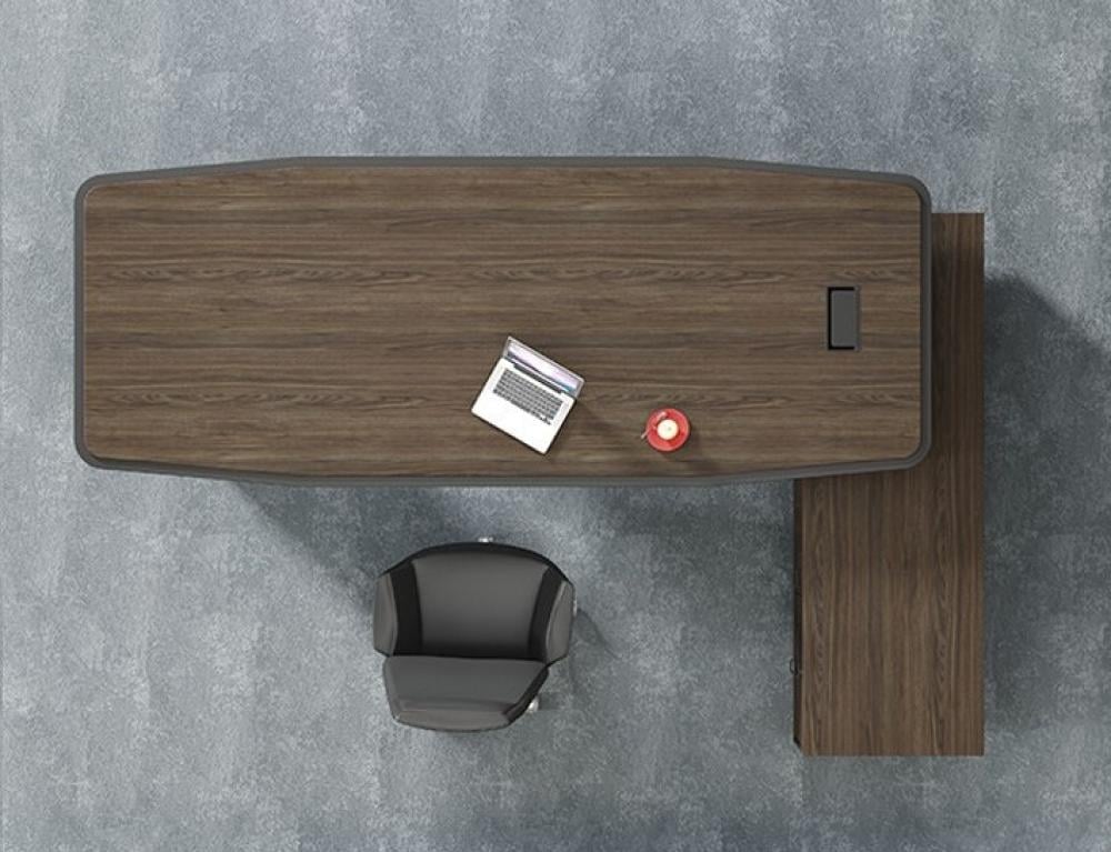 يتميز بلون بني داكن أنيق للجزء الرئيسي من المكتب، مع استخدام الرمادي مما يعزز جمالية التصميم ويعطيه لمسة كلاسيكية راقية.