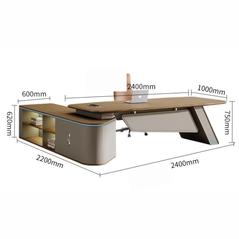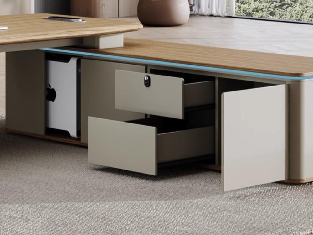 - مظهر موحّد أنيق: تناغم في التصميم بين المكتب والخزانات يعكس أناقة متناغمة في المكتب التنفيذي.