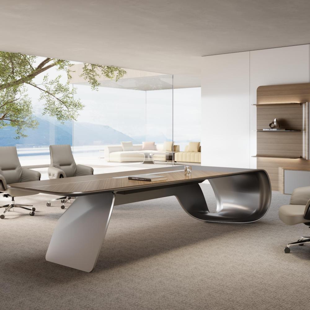المكتب الفاخر للمدير التنفيذي، المصمم بأسلوب معدني أنيق وغريب يجمع بين الابتكار والفخامة. يتميز المكتب عالي الجودة بمواد متينة وتصميم راقٍ يعكس الذوق الرفيع في كل تفاصيله، مما يجعله قطعة مركزية في أي مكتب تنفيذي.