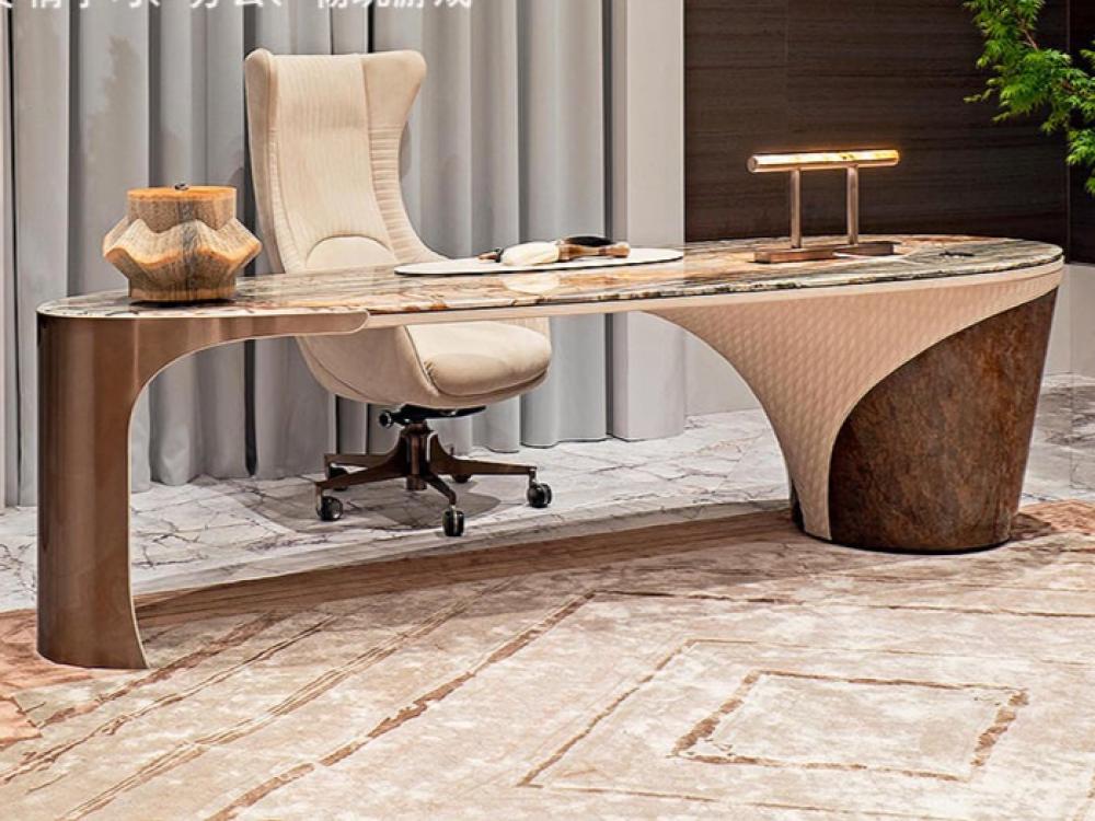 مكتب رئيسي فاخر بتصميم إيطالي، يجمع بين الرخام الطبيعي الفاخر والإضاءة الخفيفة المدمجة ليخلق جوًّا راقيًا ومترفًا داخل مساحة العمل.