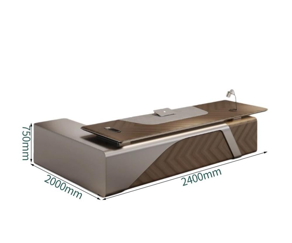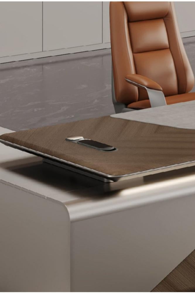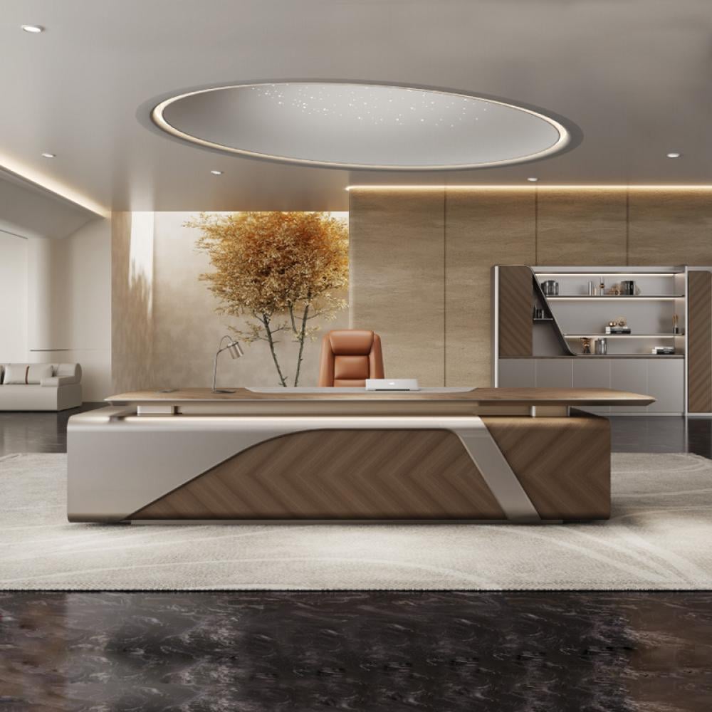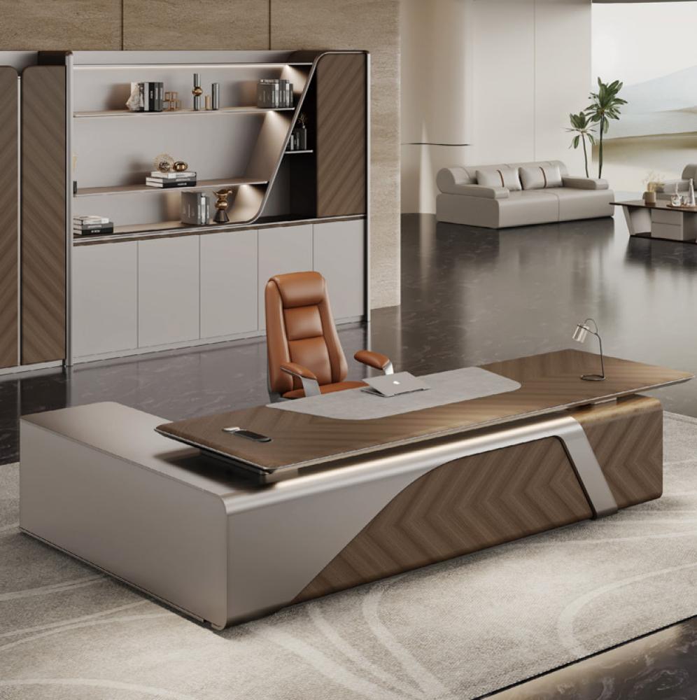 مكتب رئيس جديد وفاخر يجمع بين الأناقة والبساطة في التصميم، مصنوع من خشب البلوط الأمريكي عالي الجودة مع لمسات رمادي فضي تضفي لمسة عصرية وفخمة على مساحة العمل.