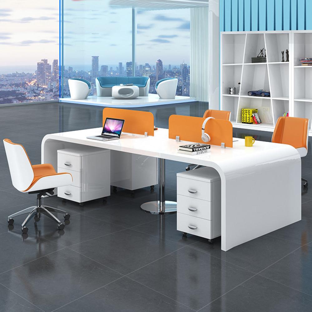 مكتب موظفين أو محطة عمل مشتركة مصنعة من الخشب الصلب ومطلية بلون أبيض وحاجز برتقالي شبيه بلون مفاتيح البيانو .