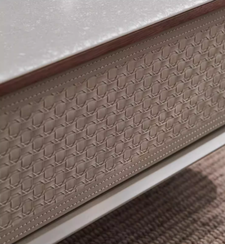 صُنعت بطبقات أنيقة من جلد صناعي عالي الجودة يشبه الجلد الطبيعي في ملمسه ومظهره، بمواد سميكة مقاومة للتآكل، بتصميم ثلاثي ابعاد ما يمنح الطاولة متانة تدوم طويلاً وأناقة تكمّل ديكور منزلك العصري وسطح من الحجر الميكروبلوري ملمس فريد عصري بالاضافه خشب الجوز لاضافه طابع دافئ.