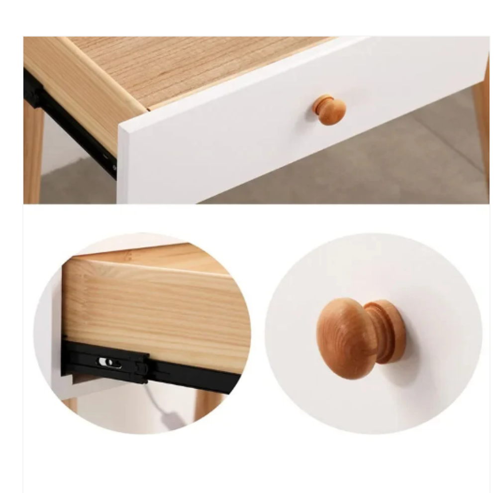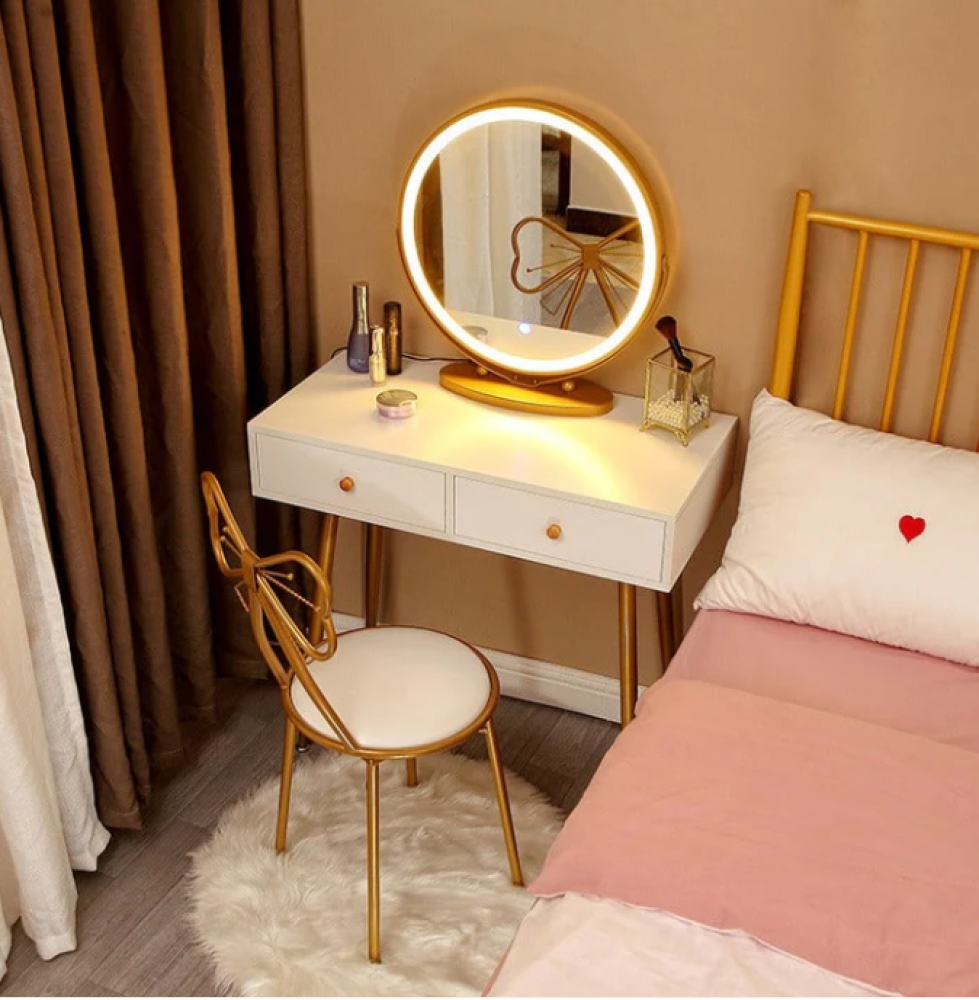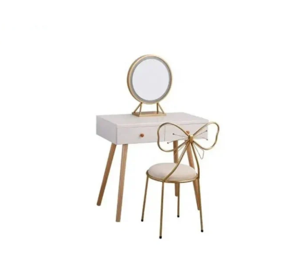 تسريحة زينة بسيطة لغرفة نوم أنيقة، مصنوعة من خشب عالي الجودة مع أدراج واسعة لتخزين مستلزمات التجميل. تحتوي على كرسي على شكل فراشة بأرجل معدنية مقاومة للصدأ ومقعد مغطى بالجلد.
