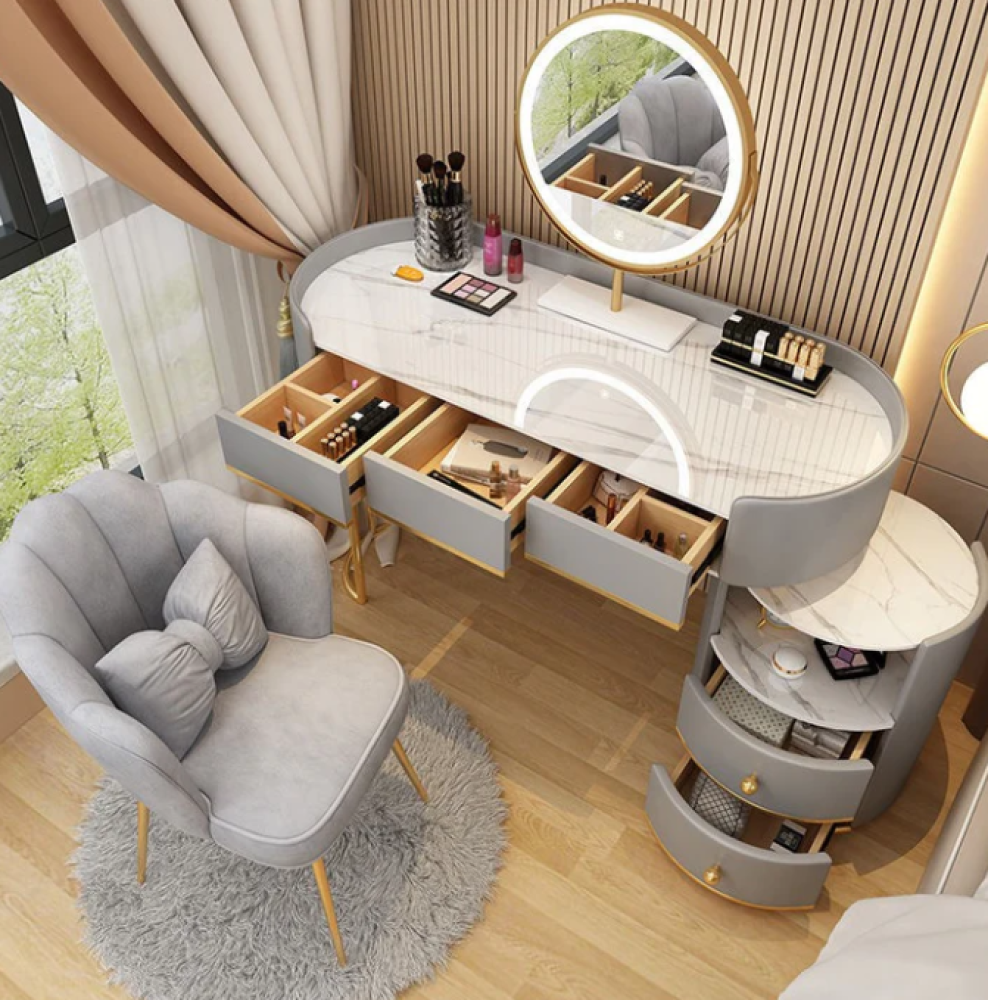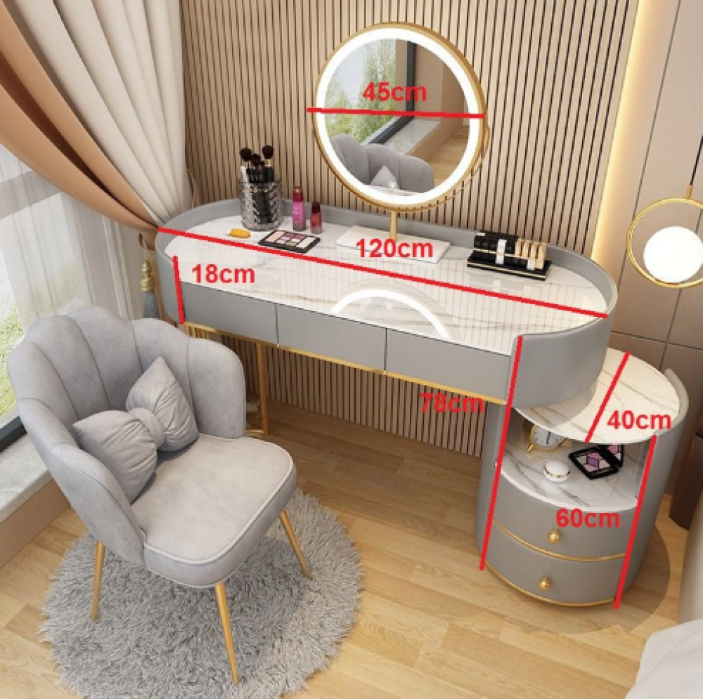 تسريحة أنيقة لغرفة النوم مع مرآة LED بقطر 45 سم، باللون الأبيض مع هيكل معدني ذهبي. السطح من رخام مقاوم للخدوش والحرارة، والجوانب مغطاة بالجلد الفاخر. تشمل كرسي خشبي مع قاعدة وظهر من الإسفنج مغطى بقماش عالي الجودة. التسريحة بمقاسات 40 سم عمق، 78 سم ارتفاع، 120 سم عرض، والكرسي بمقاسات 43 سم عمق، 85 سم ارتفاع، 47 سم عرض.