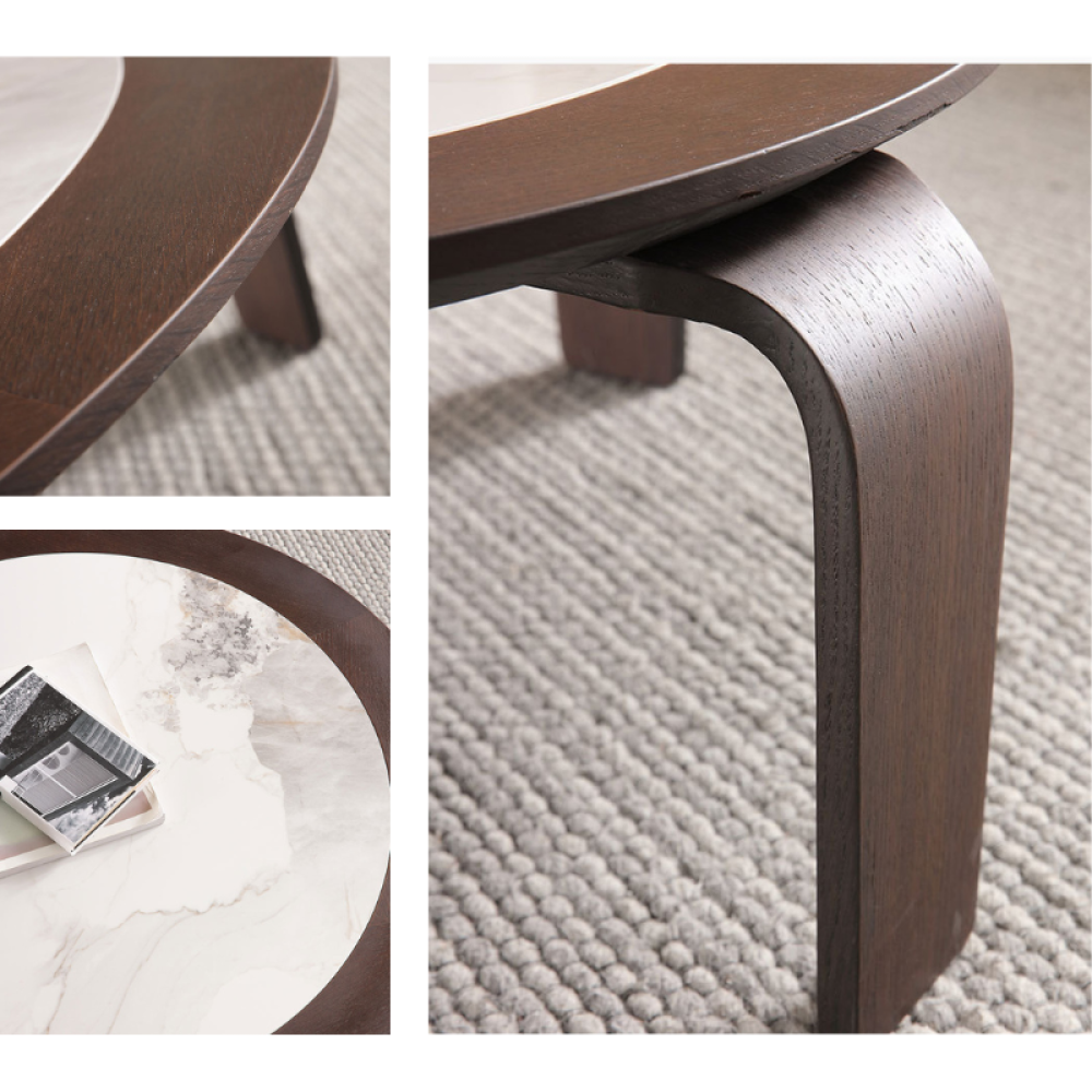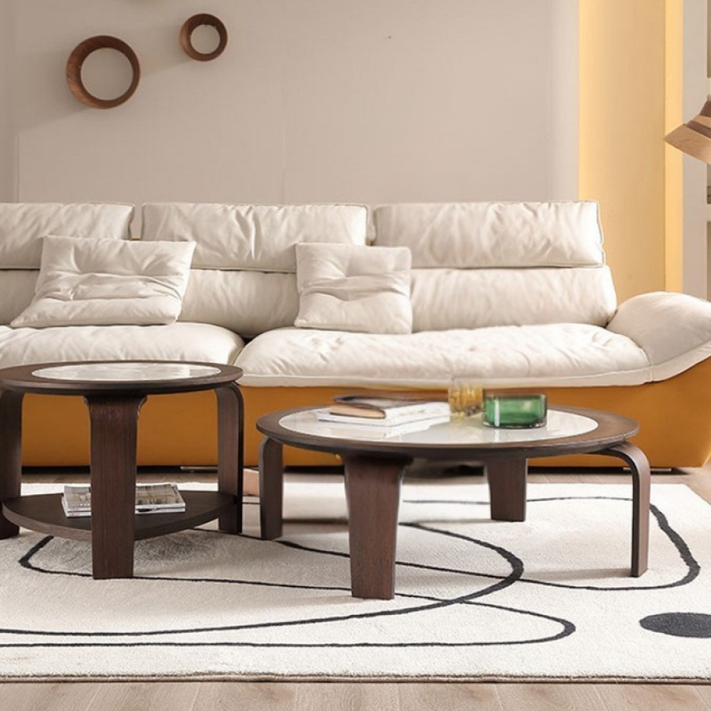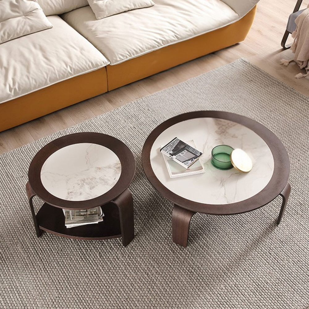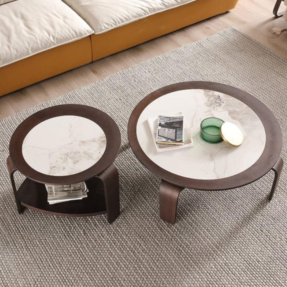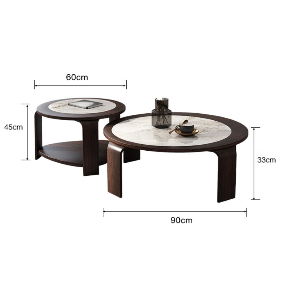 طقم طاولات شاي دائرية بتصميم عصري يجمع بين البساطة والفخامة. يتكوّن من طاولة عالية وأخرى منخفضة بتدرج أنيق يضفي لمسة فنية على مساحة الجلوس. السطح مصنوع من مادة حجرية لامعة تضيف لمسة راقية وسهولة في التنظيف، مع قاعدة متينة وثابتة.