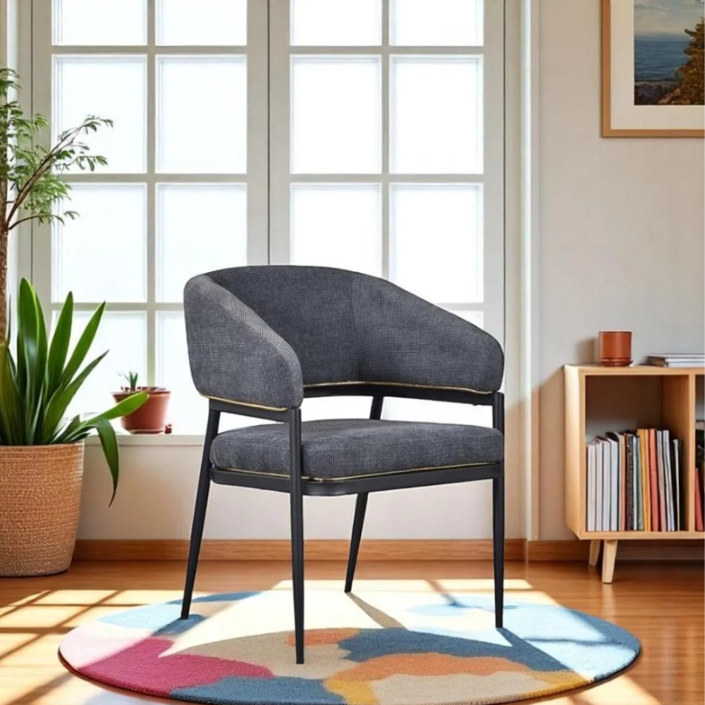 كرسي مفرد بتصميم أنيق ومريح، مغطى بقماش رمادي غامق ناعم يمنح لمسة دافئة وعصرية لأي مساحة داخلية.